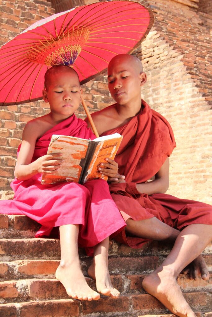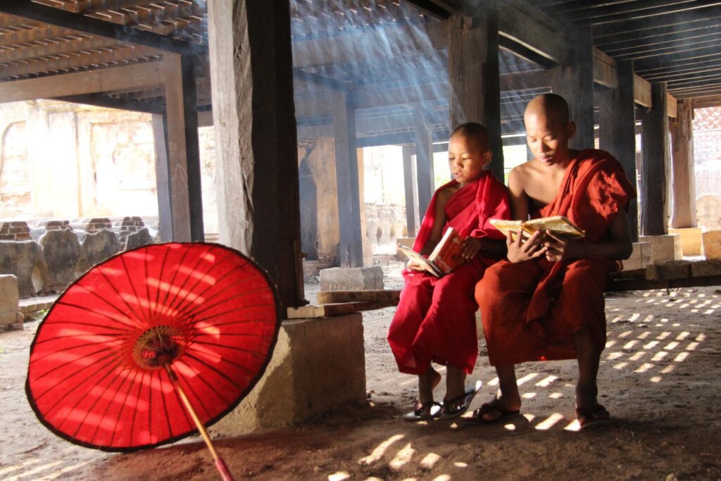 Monks reading next to the umbrella